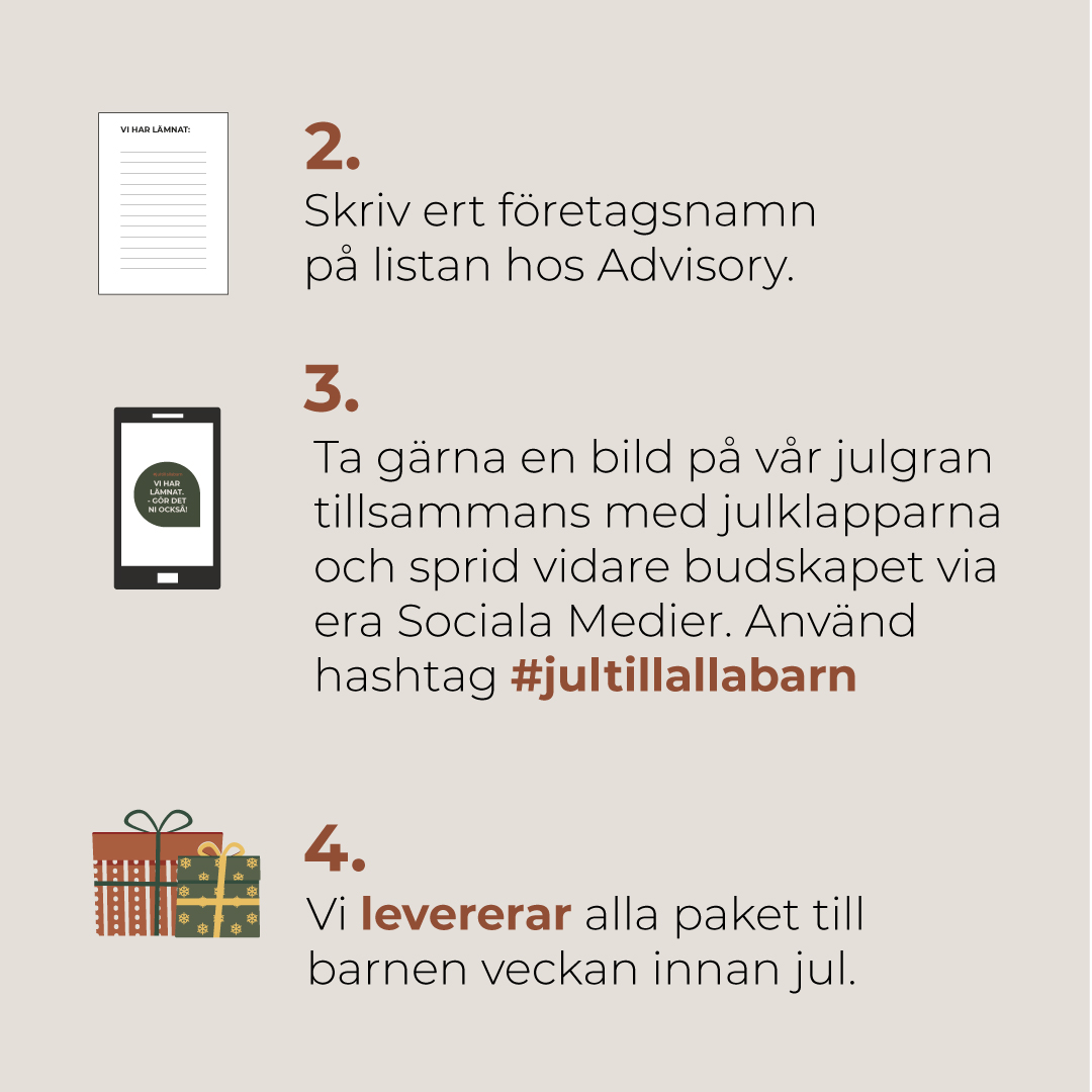 Det är nu fjärde året i rad vi på Advisory med personal har valt att starta en julklappsinsamling där ni som företag har möjlighet att lämna ert företagspaket med nya julklappar. Låt oss tillsammans ge barnen i vår närhet en mer glädjefull juletid med ert engangemang